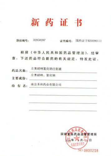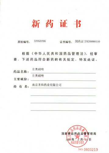 2009年8月15日,我公司具有5项国家发明专利、2项欧美专利的创新药左奥硝唑原料及氯化钠注射液制剂获国家食品药品监督管理局国家一类新药证书及生产批件。