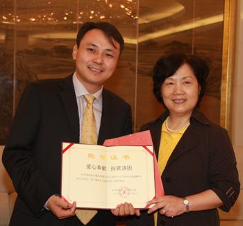 杨洁篪部长夫人、国外工作局参赞乐爱妹向王勇董事长颁发捐赠荣誉证书和感谢信