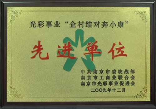 2009年12月18日下午,南京市委统战部、市工商联和市光彩事业促进会共同举办了“南京市光彩事业‘企村结对奔小康’活动先进单位”表彰大会,市领导钱继红等出席了会议。会议总结了三年来,我市光彩事业“企村结对奔小康”取得的成绩,部署了下一阶段工作,对三年来一直大力弘扬光彩事业精神,积极承担社会责任并做出突出贡献的非公有制经济组织进行表彰。会上,我公司被授予“南京市光彩事业‘企村结对奔小康’活动先进单位”称号。