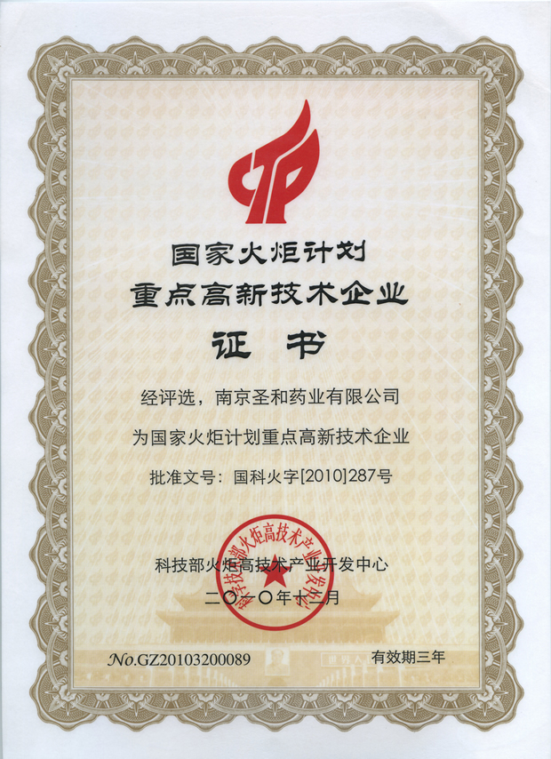 2010国家火炬计划重点高新技术企业证书