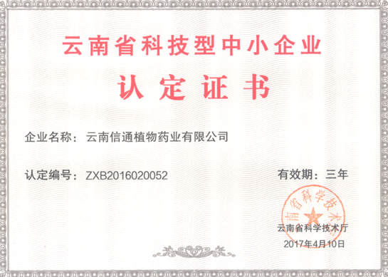 本网讯 云南信通植物药业有限公司继2015年获云南省科技厅认定为 “中药现代化科技产业(云南)基地中药材种植科技示范园”和“云南省农业科技示范园”后,2017年4月云南省科技厅再次认定云南信通植物药业有限公司为“云南省科技型中小企业”,6月正式颁发证书并授牌。