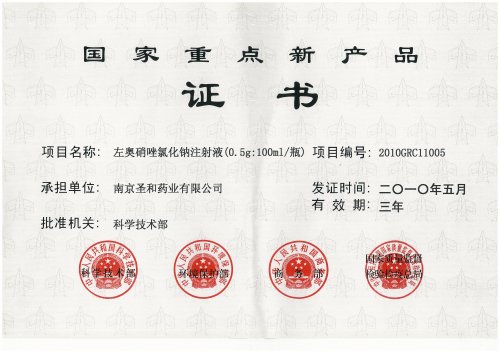 左奥硝唑氯化钠注射液于2009年8月获得国家食品药品监督管理局新药证书及药品注册批件,并已获得国家发明专利5项,国际专利2项,并获得“2009年中国十方处方药重磅新品”,现已正式上市销售。