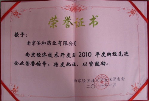 2011年1月24日,南京经济技术开发区管委会召开了2010年度纳税表彰大会,对区内在2010年度为开发区经济发展和税收方面做出重要贡献的企业进行表彰。我司在此次评选中获“纳税先进企业”称号。