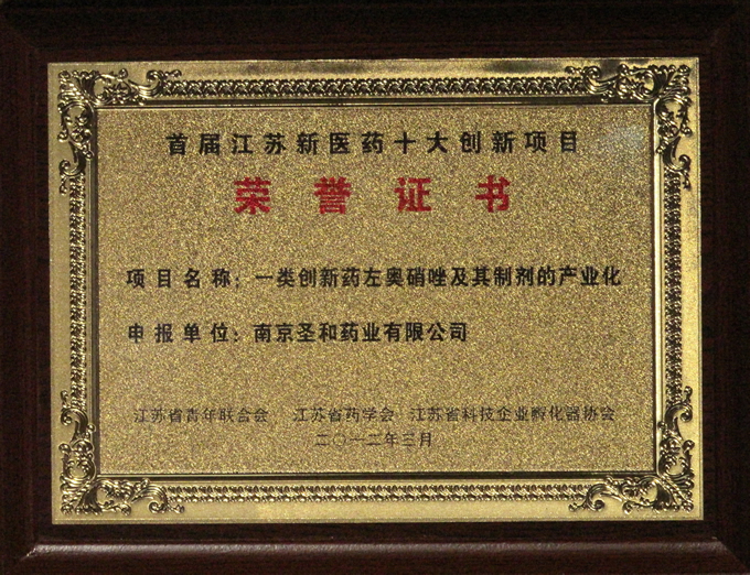 为了深入实施科教兴省和人才强省战略,促进新医药等六大新兴产业的发展,发现和凝聚一批青年创新创业领军人才,江苏省青年联合会、江苏省药学会、江苏省科技企业孵化器协会联合在全省范围内开展了首届江苏新医药科技创新创业项目大赛暨青年科技领军人才举荐活动。目前,我司申报的“一类创新药左奥硝唑及其制剂的产业化”项目,被授予“首届江苏新医药十大创新项目”荣誉称号。