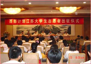 2003年8月23日上午,团省委、省教育厅、省财政厅、省人事厅联合举行江苏大学生志愿服务西部计划出征仪式,欢送我省415名大学生志愿者赴陕西、广西、云南三省区贫困地区乡镇基层从事为期1—2年的教育、卫生、农技、扶贫等方面的志愿服务。省委副书记冯敏刚,省委常委、组织部长徐国健,副省长吴瑞林出席了仪式。